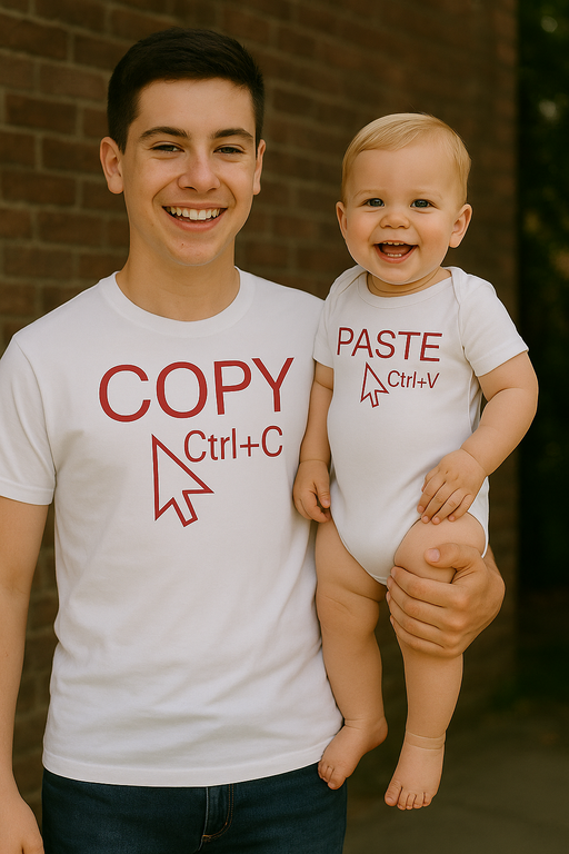 Hiir klikib, pere kopeerib: COPY Ctrl+C ja PASTE Ctrl+V ühes lõbusas komplektis! 😍 Kui vanem ja beebi astuvad üles dünaamilise duona: originaal T-särgil, koopia bodil. Valge klassika punase trüki ja hiirekursori noolega toob kohesed naeratused jalutuskäigul, külaskäikudel ja pildistamisel. Näidake maailmale, kes on Ctrl ja kes on V! 😜