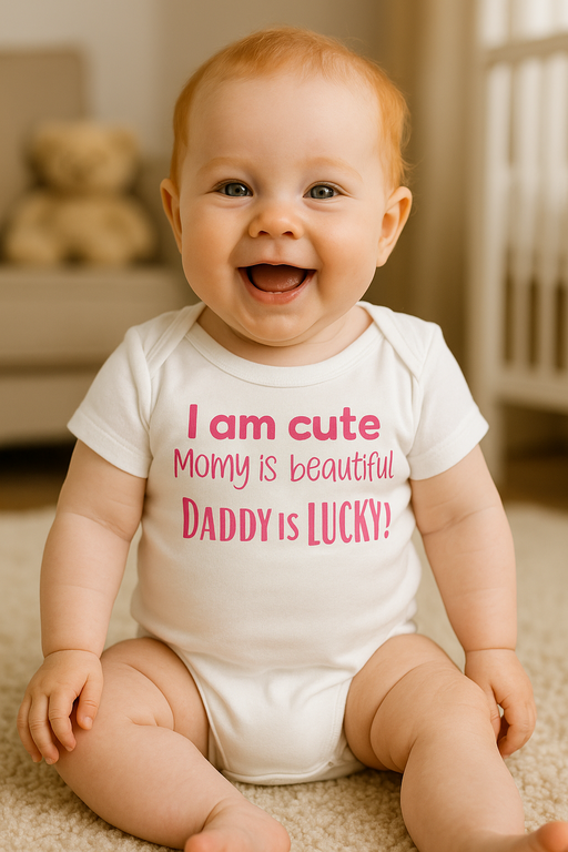 😎 Kui beebi ütleb tõtt: “I am cute Momy is beautiful DADDY is LUCKY!” – ja teeb seda stiilselt! See vallatu valge beebibodi tõstab tuju iga mähkmevahetuse ja külaskäigu ajal. Kõik saavad kohe aru, kuidas kodus asjad käivad: pisike on cute, emme on beautiful ja issi on… täiesti LUCKY!