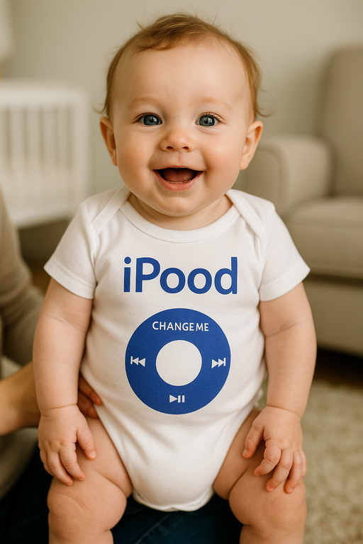 See valge beebibodi sinise trükiga parodeerib mp3-mängijat ja sellel on kõige ausam esitusnimekiri: vaiksest alarmist kuni suurhittideni, mis kutsuvad värske mähkme järele.
