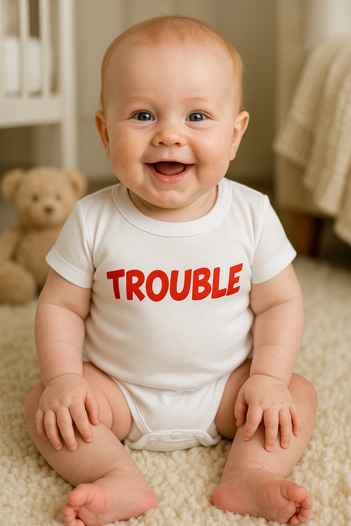 Kui peal on TROUBLE, on action garanteeritud! 😜 Valge beebibodi punase kirjaga ütleb tõe sinu eest. Täiuslik väikestele väänikutele ja huumorisoonega vanematele! 🎈
