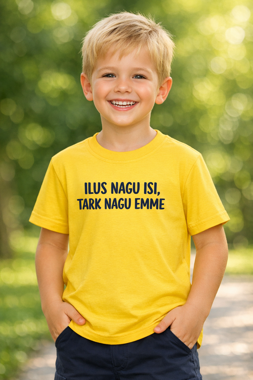 „ILUS NAGU ISSI, TARK NAGU EMME“ on lõbus ja enesekindel sõnum, mis paneb naeratama nii lapsi kui ka vanemaid. Päikesekollane toon ja selge print teevad sellest särgi, mida kantakse hea meelega ikka ja jälle.