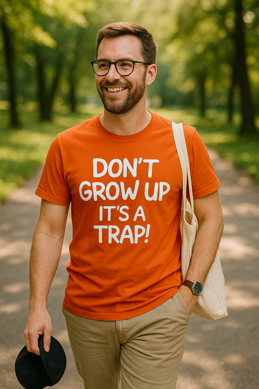 🙃 DON’T GROW UP IT’S A TRAP! – oranž T-särk, mis paneb täiskasvanuelu pausile.