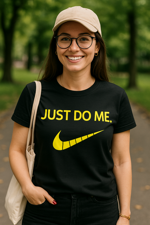 😎 Ilma keerutamata: JUST DO ME ja naeratus tuleb ise. Must lühikeste varrukatega T-särk kollase kirjaga ja stiliseeritud swooshiga on julge vihje, millest saab igaüks aru. Kanna kohtingul, klubis või kodusel diivanil – reaktsioonid ulatuvad naerust aplausini. Kui vibe on õige, pole sõnu vajagi.