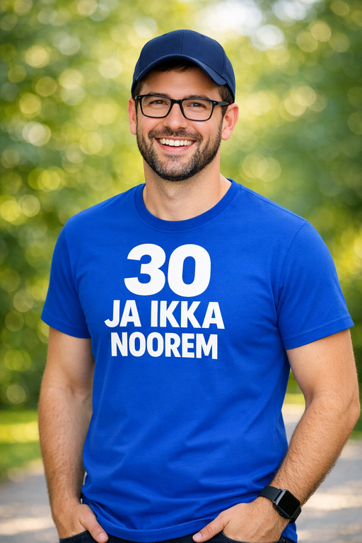 30 JA IKKA NOOREM on täpselt see lause, mis paneb peol naeratama nii sünnipäevalapse kui ka külalised. Kuninglik sinine toon ja suur valge trükk teevad sõnumi nähtavaks juba kaugelt.