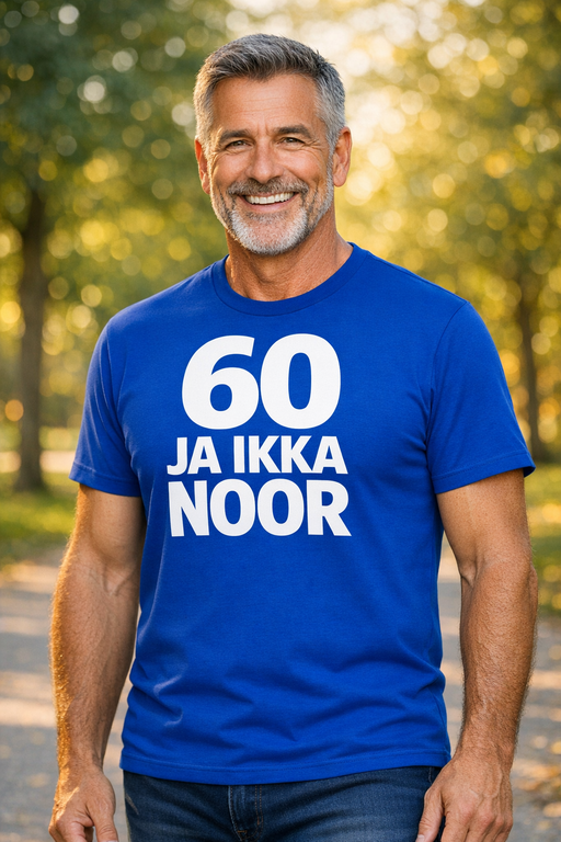 Sinine lühikeste varrukatega T-särk valge kirjaga 60 JA IKKA NOOR annab selge signaali: vanus on kogemus, mitte pidur, ja hea tuju sobib igasse päeva.