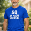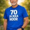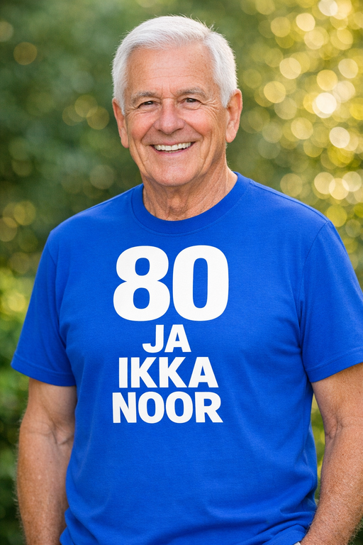 80 küünalt? Puhu need stiilselt ära! See sinine T-särk tekstiga „80 JA IKKA NOOR“ ütleb kõigile, et sünnipäevalaps on hinges endiselt noor.
