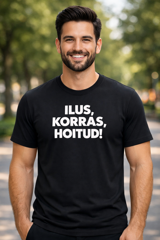 Must klassika ja suur valge tekst ILUS, KORRAS, HOITUD! teevad mulje hetkega – minimalistlik, enesekindel ja paras annus iroonilist huumorit.